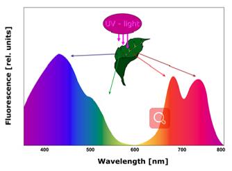 ü UV紫外光激發(fā)多光譜熒光成像技術(shù): UV紫外光對植物葉片激發(fā),可以產(chǎn)生具有4個特征性波峰的熒光光譜,4個波峰的波長為藍光440nm(F440)、綠光520nm(F520)、紅光690nm(F690)和遠紅外740nm(F740),其中F440和F520統(tǒng)稱為BGF,由表皮及葉肉細胞壁和葉脈發(fā)出,F(xiàn)690和F740為葉綠素熒光Chl-F。紫外光激發(fā)多光譜熒光可以用來靈敏、特異性地評估植物生理狀態(tài)包括受脅迫狀態(tài),包括干旱、病蟲害、環(huán)境污染、氮脅迫等
