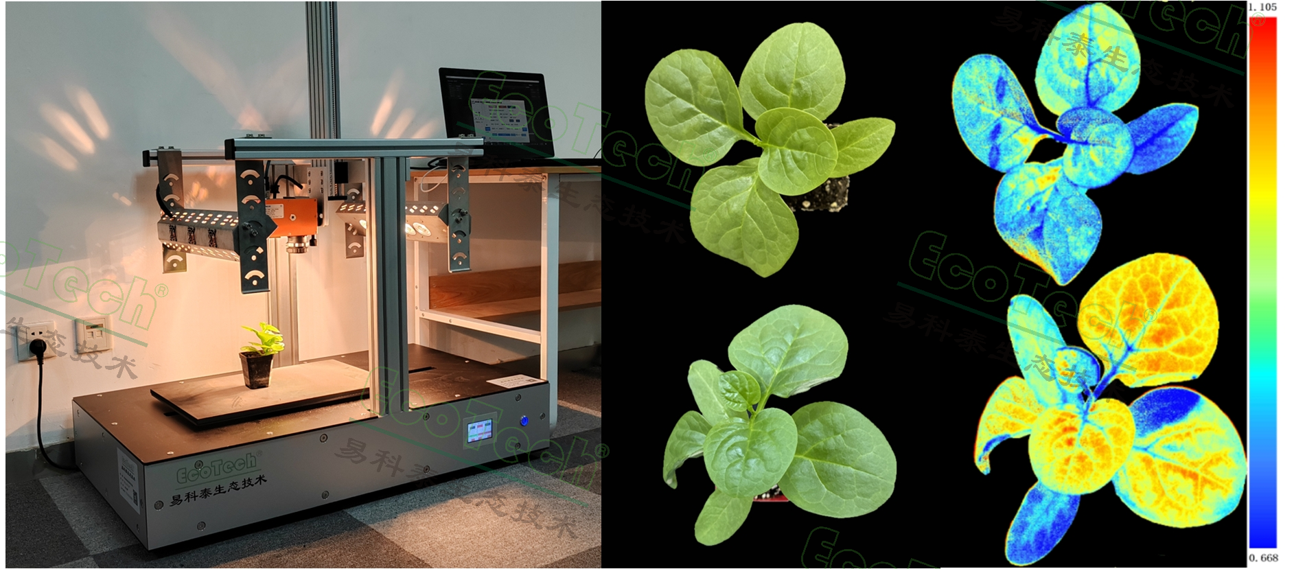 左:SpectraScan高光譜成像掃描平臺(tái),右:不同處理的盆栽木耳菜(下面植株土壤施加DCMU)RGB及高光譜成像反射指數(shù)圖(EcoTech®實(shí)驗(yàn)室提供)