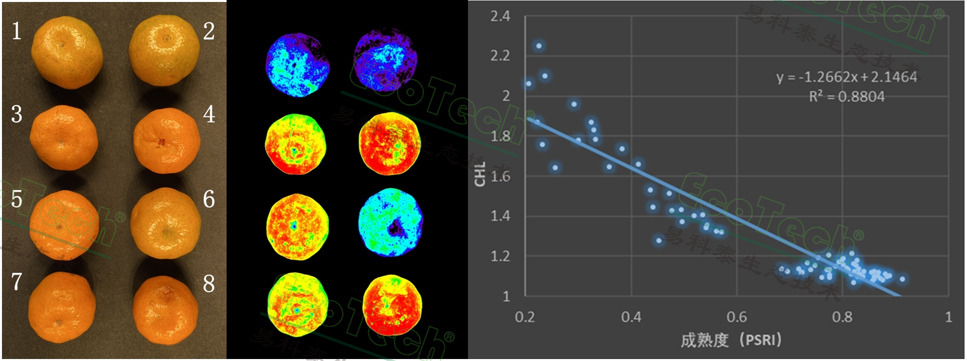自左至右依次為:橘子RGB圖、高光譜成熟度指數(shù)圖,成熟度與葉綠素指數(shù)的相關(guān)關(guān)系(下面植株土壤施加DCMU)RGB及高光譜成像反射指數(shù)圖(EcoTech®實(shí)驗(yàn)室提供)