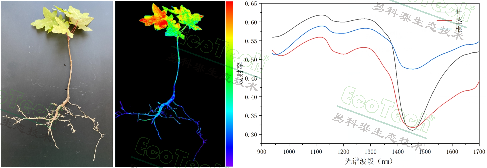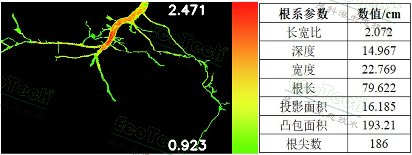 基于SpectrAPP軟件的根系分析結(jié)果。左圖為R1100/R1450,顯示了根系不同部位的水分分布狀態(tài),右圖為根系形態(tài)分析結(jié)果