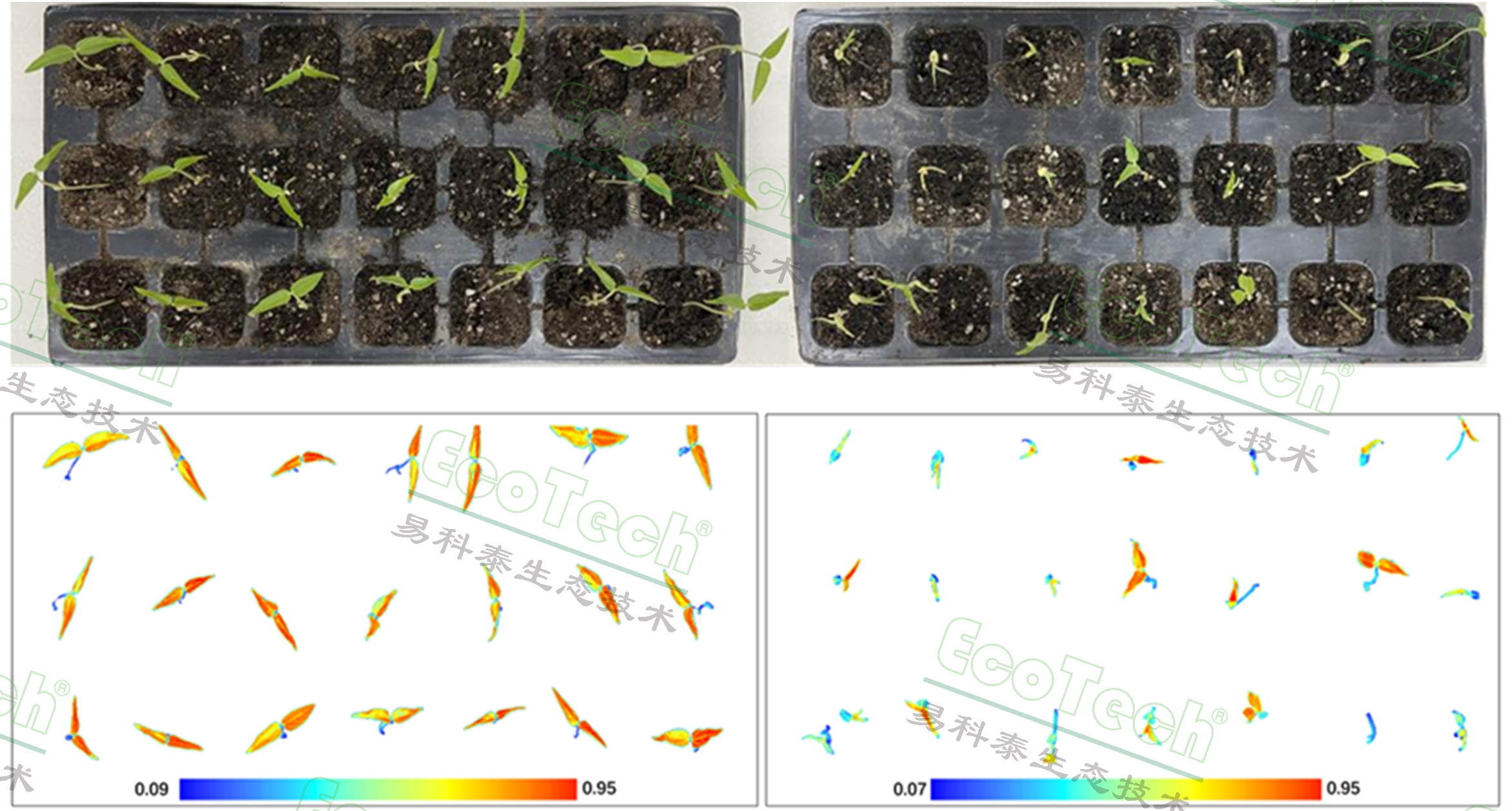 不同處理下的綠豆種苗高光譜成像檢測:左側(cè)苗盤土壤施加營養(yǎng)液(氮磷鉀及中微量元素),右側(cè)為對照組,通過HI指數(shù)反映出施加營養(yǎng)液的種苗健康狀態(tài)明顯高于未施加種苗