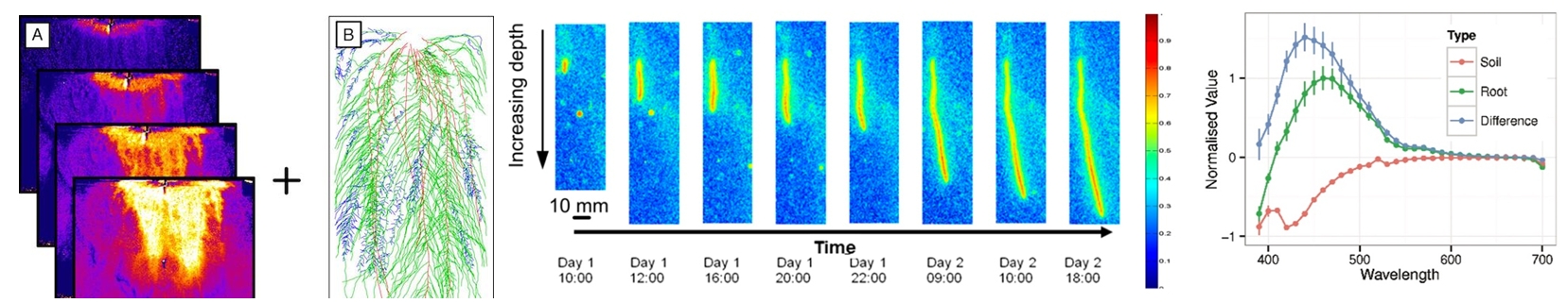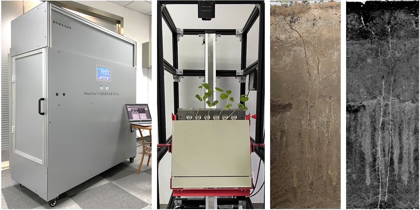 自左至右依次為:RhizoTron®根系高光譜成像分析系統(tǒng)、系統(tǒng)內(nèi)部結(jié)構(gòu)圖(包括側(cè)面傾斜自動(dòng)掃描成像平臺(tái)、RhizoBox、頂部成像傳感器等)、棉花根系RGB成像、棉花根系高光譜成像分析(900-1700nm)