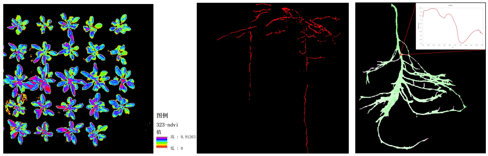 左圖為頂部冠層高光譜成像(NDVI),右圖為根系成像提?。‥coTech®實(shí)驗(yàn)室提供)