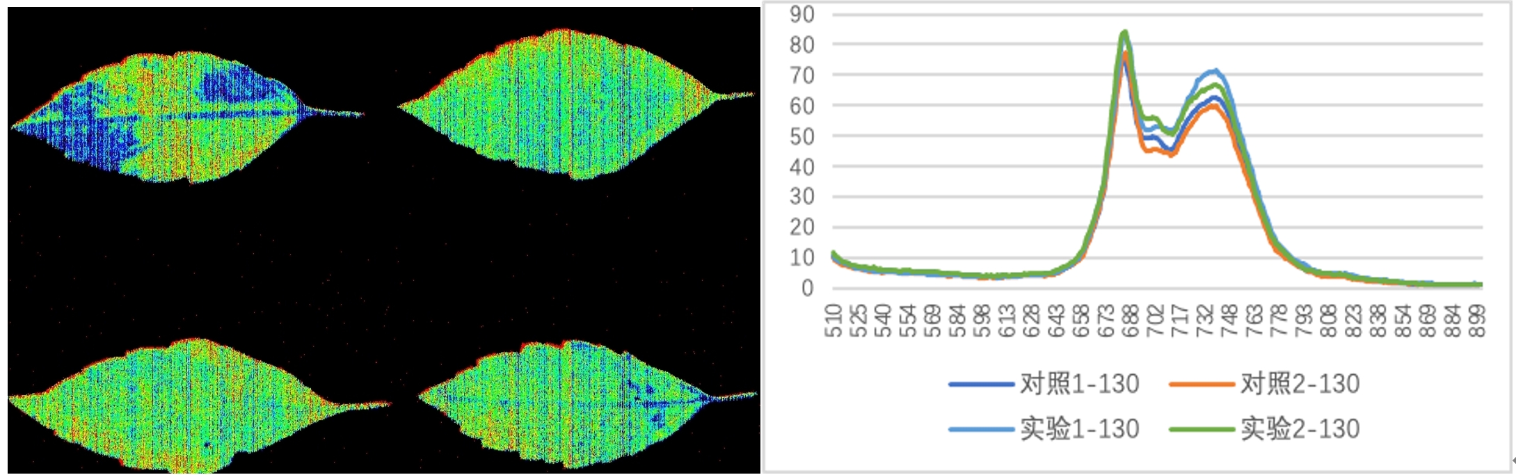 敵草隆處理烏蘞莓實驗:左圖左上角和右下角為實驗組(葉柄浸藥)、右上角和左下角為對照組,可以看出實驗組的葉柄和葉脈最大光量子產(chǎn)量QY_max明顯降低(藍色);右圖為其葉綠素?zé)晒夤庾V,實驗組葉綠素?zé)晒饷黠@高于對照組(易科泰SpectrAPP光譜成像實驗室提供)