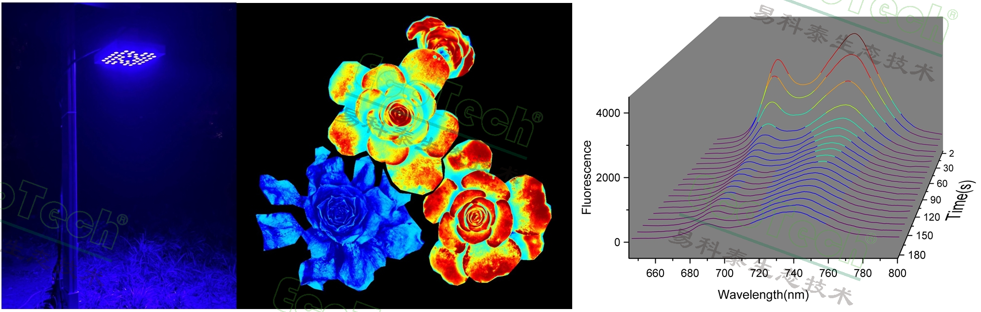 左圖FluorTron®葉綠素?zé)晒獬上翊筇锉O(jiān)測(cè);中圖:葉綠素?zé)晒獬上瘢挥覉D:葉綠素?zé)晒夤庾V動(dòng)態(tài)(EcoTech®實(shí)驗(yàn)室提供)