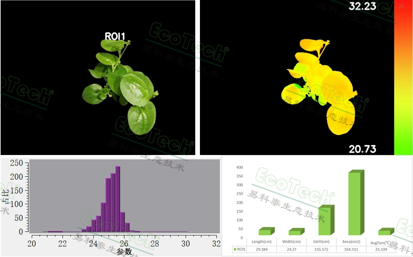 • 可對精準(zhǔn)選取的ROI(如脅迫植物和未脅迫植物)進行溫度分析:包括最低溫度、最高溫度、平均溫度、頻率直方圖等,并據(jù)此分析病害等脅迫葉片氣孔導(dǎo)度、溫度的影響及響應(yīng)