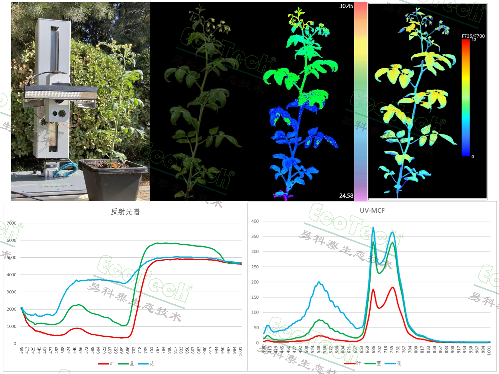 上圖依次為智能機(jī)器人表型平臺(tái)側(cè)面掃描成像,及番茄植株RGB成像、熱成像、F735/F700熒光比值(精確反映葉綠素含量),下為番茄不同部位的反射光譜和熒光光譜
