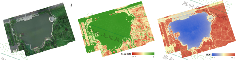 左圖:人工湖及周邊RGB圖,反映地物空間分布;中圖:紅邊比值指數(shù),突出顯示綠色植被內(nèi)部的差異;右圖:歸一化差異水體指數(shù)NDWI(易科泰光譜成像與無人機遙感技術研究中心供圖)