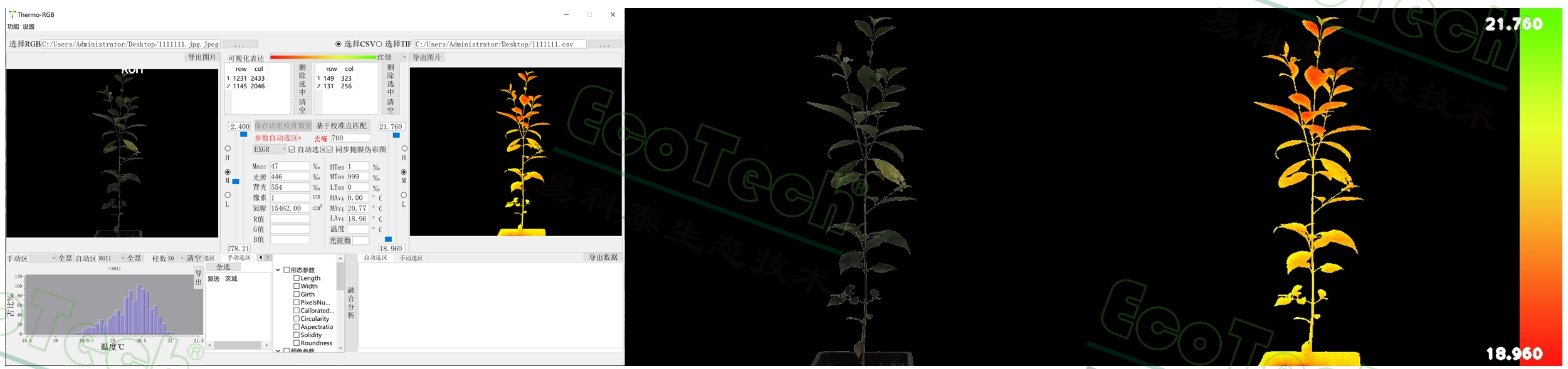 5. ThermoRGB成像融合分析:可進(jìn)行手動(dòng)/自動(dòng)ROI分析;光照/背光葉片長(zhǎng)度、寬度、周長(zhǎng)、凸包面積、圓度等形態(tài)分析;最高、最低、平均溫度、溫差等溫度分析;R/G/B顏色分析,具備溫度直方圖統(tǒng)計(jì)、路勁分析、溫度轉(zhuǎn)換、圖/表導(dǎo)出等功能
