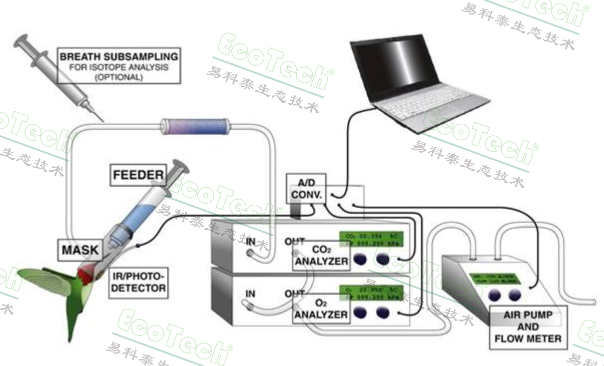 Welch Jr等(2011)利用飼喂罩作為呼吸室(系統(tǒng)配置包括飼喂罩、CA-10二氧化碳分析儀、FC-10氧氣分析儀、SS-3氣體抽樣單元、UI-2數(shù)據(jù)采集系統(tǒng)等,參見(jiàn)下圖),對(duì)蜂鳥能量代謝進(jìn)行了研究,研究結(jié)果參見(jiàn):The power of feeder-mask respirometry as a method for examining hummingbird energetics. Comparative Biochemistry and Physiology. Part A 158, 276-286.