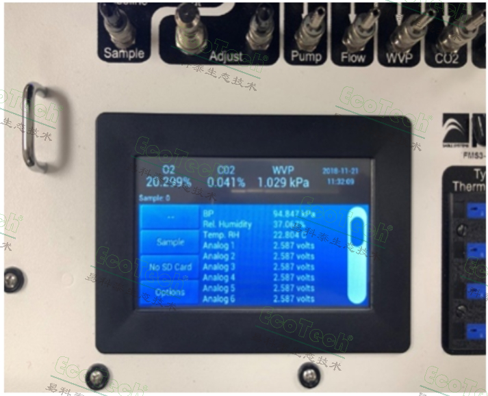 2)超大觸摸屏實(shí)時(shí)顯示儀器各參數(shù),可同時(shí)顯示氧氣、二氧化碳、水汽壓、大氣壓、相對(duì)濕度、模擬輸入信號(hào)、儲(chǔ)存大小、取樣情況、日期時(shí)間序列等數(shù)據(jù)
