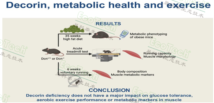 實驗測試結(jié)果表明,缺乏decorin不影響該小鼠肥胖或葡萄糖耐受不良的發(fā)展,對骨骼肌纖維大小或與代謝、肌發(fā)生或ECM形成相關(guān)的基因的表達沒有重大影響。