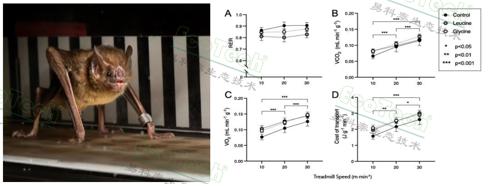 多倫多大學(xué)生理學(xué)家朱莉婭·羅西和加拿大麥克馬斯特大學(xué)肯尼思·韋爾奇從吸血蝙蝠經(jīng)常依靠奔跑來追蹤和捕獲獵物的觀察中找到靈感,通過FMS便攜式能量代謝測量儀和動物跑步機,以及采用同位素標(biāo)記的牛血食物來研究24只吸血蝙蝠的新陳代謝機制。通過讓蝙蝠以不同的速度(每分鐘10、20和 30米)在跑步機上奔跑,同時測量它們的新陳代謝率(耗氧量和二氧化碳產(chǎn)生量等指標(biāo),見下圖右)。
