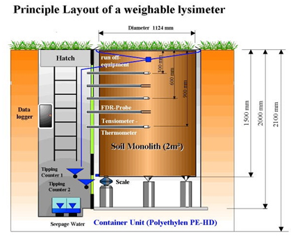 2008 UGT設(shè)計(jì)安裝的歐洲最大的蒸滲儀監(jiān)測站,位于瑞士Rechenholz,由72個(gè)蒸滲儀組成,其中12個(gè)為稱重式蒸滲儀,60個(gè)為非稱重式;蒸滲儀面積為1m2,高150cm。用于研究監(jiān)測不同作物種類、不同耕作條件(包括施肥制度)、不同土壤類型條件下的水分平衡與氮平衡關(guān)系。蒸滲儀配備有自動(dòng)液壓升降系統(tǒng),需要對(duì)傳感器等進(jìn)行全面維護(hù)時(shí),蒸滲儀可以降至地下維護(hù)室進(jìn)行維護(hù)檢修。