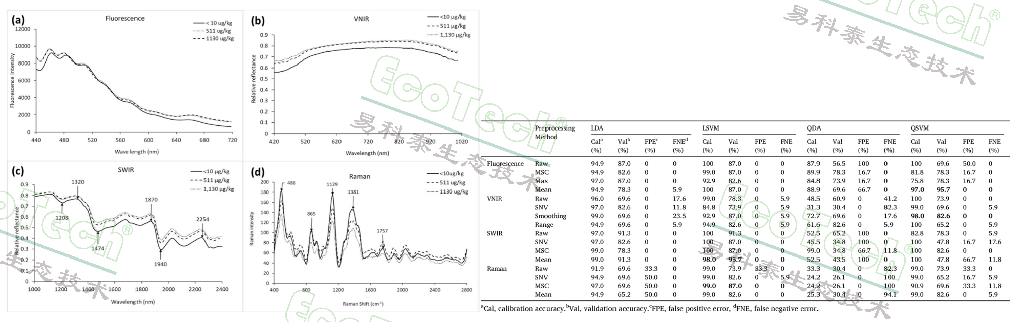 表1:四種高光譜成像系統(tǒng)結合不同預處理方法對黃曲霉毒素污染樣本進行分析時,線性判別分析(LDA)、線性支持向量機(LSVM)、二次判別分析(QDA)和二次支持向量機(QSVM)模型的驗證結果。