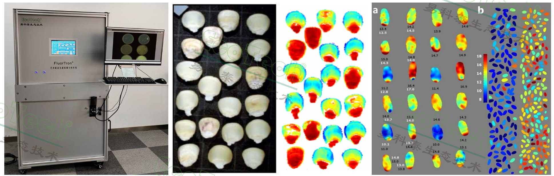 圖2:FluorTron®多功能高光譜成像系統(tǒng)、真菌感染的玉米籽粒識別效果圖、小麥籽粒蛋白質含量分布圖