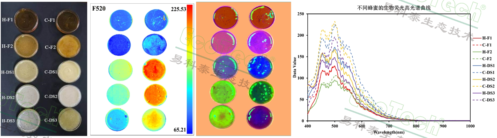 圖3:使用FluorTron®多功能高光譜成像系統(tǒng)對不同蜂蜜樣品進行紫外光激發(fā)的生物熒光數據分析,從左到右:蜂蜜樣品RGB圖像、F520熒光成像圖、不同品質蜂蜜分類圖及其在紫外燈下400-1000nm的熒光光譜