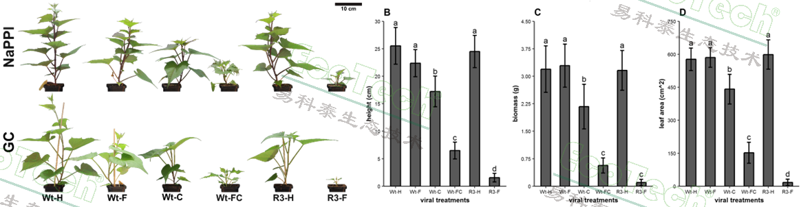 結(jié)果表明,與健康植株(Wt-H)和僅感染SPFMV(Wt-F)的植株相比,感染SPCSV(Wt-C)、共感染(Wt-FC)以及轉(zhuǎn)基因感染(R3-F)的植株生長(zhǎng)受到顯著抑制,表現(xiàn)為株高降低、生物量和葉面積減少。