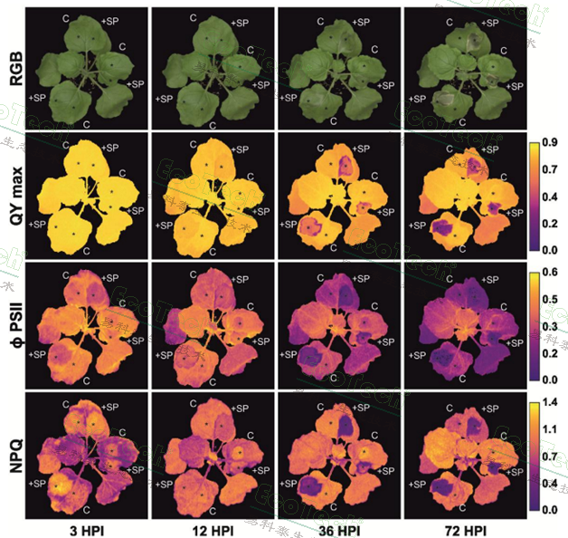 左圖:接種病菌的云杉根部和HpSSP35.8的表達(dá)動(dòng)力學(xué);右圖:本氏煙葉片的葉綠素?zé)晒馀cRGB彩色成像參數(shù)動(dòng)態(tài)變化,葉綠素?zé)晒鈪?shù)包括QYmax、ΦPSII和NPQ,RGB彩色成像圖轉(zhuǎn)化為色調(diào)飽和度數(shù)據(jù)(Hue-Saturation-Brightness)