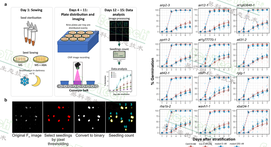 左圖:高通量葉綠素?zé)晒獬上穹治龉ぷ髁鞒?;a.播種、放置樣品、成像測(cè)量、圖像分析;b.最大葉綠素?zé)晒釬m成像圖的分析過(guò)程;右圖:不同處理的發(fā)芽率動(dòng)態(tài)曲線