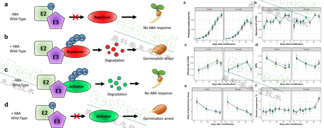左:泛素E3連接酶在ABA反應(yīng)途徑中的功能假說(shuō);右:對(duì)應(yīng)處理的冠層投影面積、各項(xiàng)葉綠素?zé)晒鈪?shù)、冠層溫度的動(dòng)態(tài)曲線