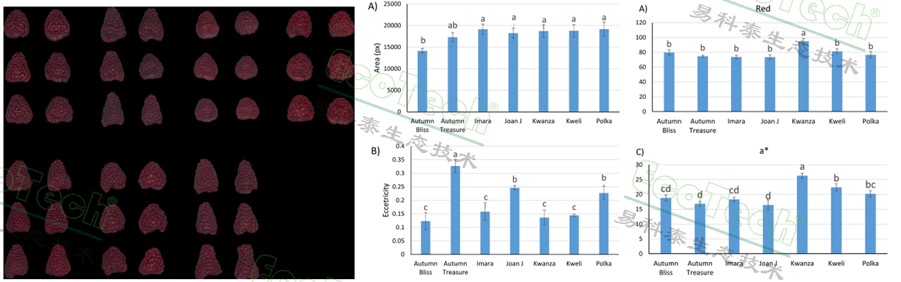 果實(shí)面積直接反映果實(shí)的大小。偏心率則可以反映果實(shí)的圓度,其中“Autumn Treasure”的果實(shí)最橢圓(偏心率最高),其他品種則更接近圓形。顏色分析則表明“Kwanza”的果實(shí)是最紅、最亮的。高通量RGB成像分析可高效分析果實(shí)形狀和顏色,非常適用于自動(dòng)化成熟度判斷和采后品質(zhì)評(píng)估。