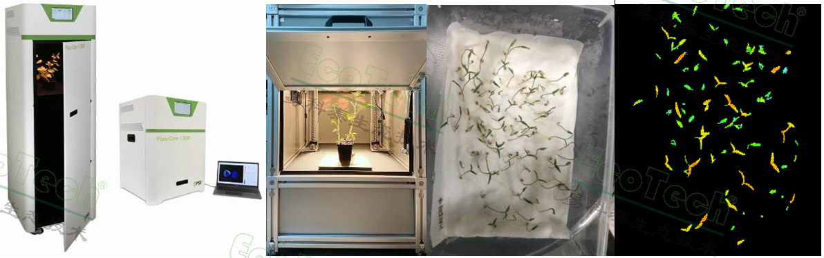 左圖:新一代FluorCam1300多激發(fā)光多光譜熒光成像系統(tǒng);中:FluorTron®植物光合表型成像分析系統(tǒng);右:利用易科泰葉綠素?zé)晒獬上窦夹g(shù)測(cè)量番茄種子萌發(fā)率并評(píng)估種苗活力