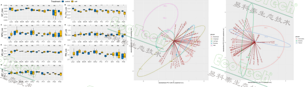 圖1. 左圖:不同基因型生菜樣品對鹽脅迫響應(yīng)的葉綠素?zé)晒鈪?shù)變化;中圖:不同生菜類型的 PCA 分析圖;右圖:鹽脅迫下基因型 PCA 分析圖;