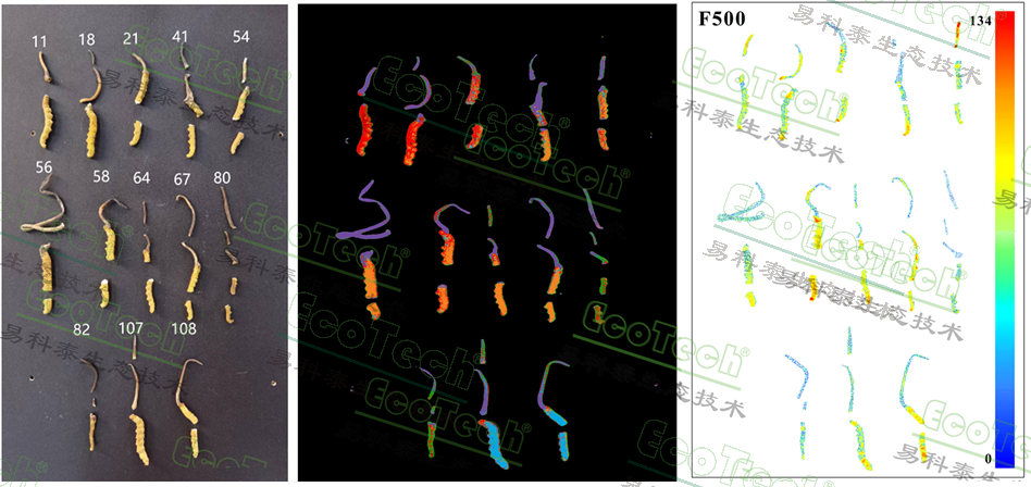 左圖為FluorTron®多功能高光譜成像系統(tǒng);右圖為人參的綠色熒光圖(左:7年;中:9年;右:15年)