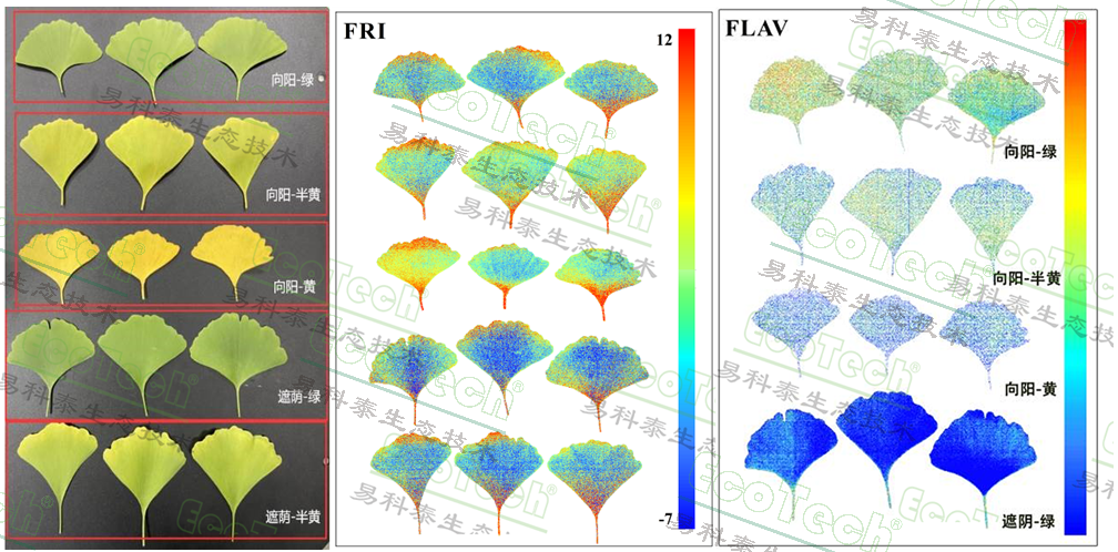 易科泰實(shí)驗(yàn)室的研究人員利用FluorTron®多功能高光譜成像系統(tǒng),對不同狀態(tài)下銀杏葉的黃酮醇含量進(jìn)行了無損活體成像檢測。結(jié)果顯示:陽光照射下的銀杏葉黃酮醇含量高于遮陰處;完全變黃的葉片反而低于綠色和半黃半綠葉片——其中,陽光直射下的半黃半綠葉片含量最高。這一發(fā)現(xiàn)打破了“以色論質(zhì)”的傳統(tǒng)認(rèn)知,也讓人看到:僅憑肉眼觀察,難免陷入“盲人摸藥”的誤區(qū)。