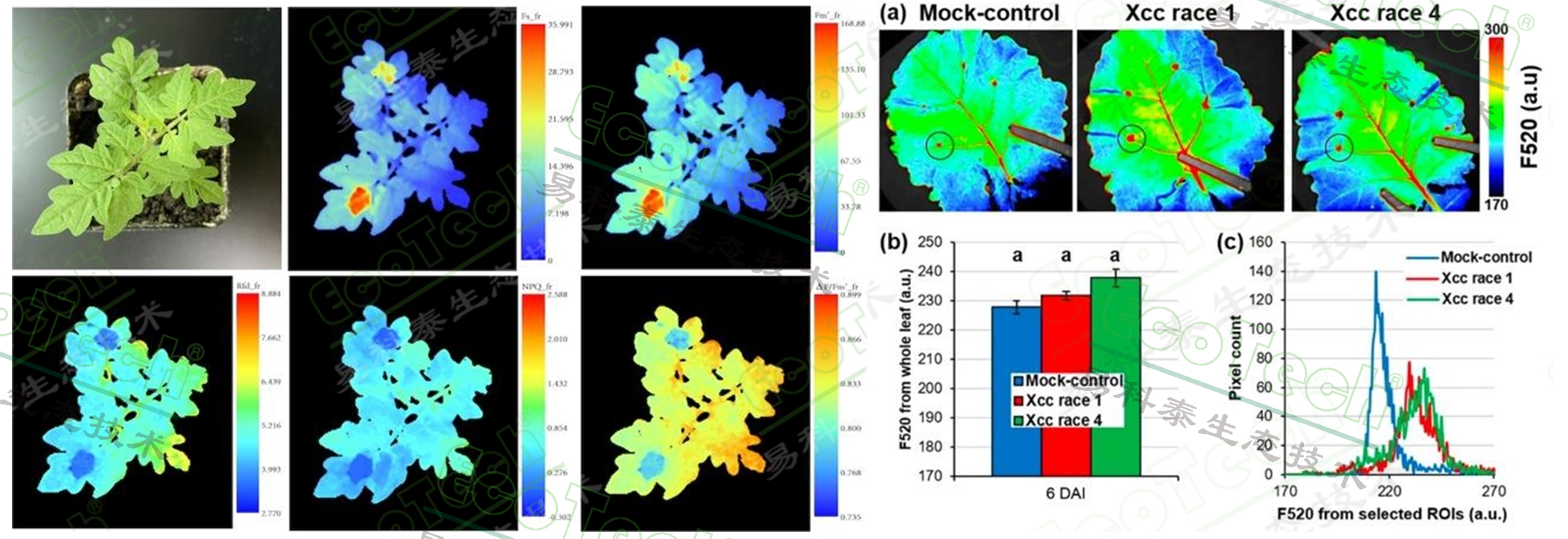 左圖:番茄光合作用損傷實(shí)驗(yàn)(EcoTech®實(shí)驗(yàn)室提供);右圖:機(jī)器視覺多光譜熒光成像檢測氣候變化條件下油菜黑腐病,F520為多光譜熒光成像綠色熒光(引自:Monica Pineda and Matilde Baron, 2023. Assessment of Black Rot in Oilseed Rape Grown under Climate Change Conditions Using Biochemical Methods and Computer Vision)