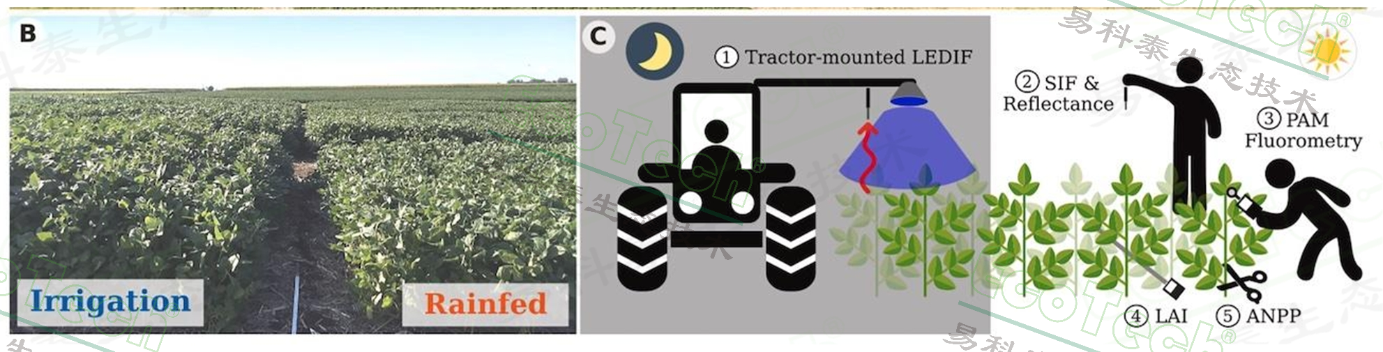 左圖:FluorTron-ROBOT葉綠素?zé)晒獬上裱矙z機(jī)器人;右圖:EcoDrone®無人機(jī)遙感NDVI影像圖