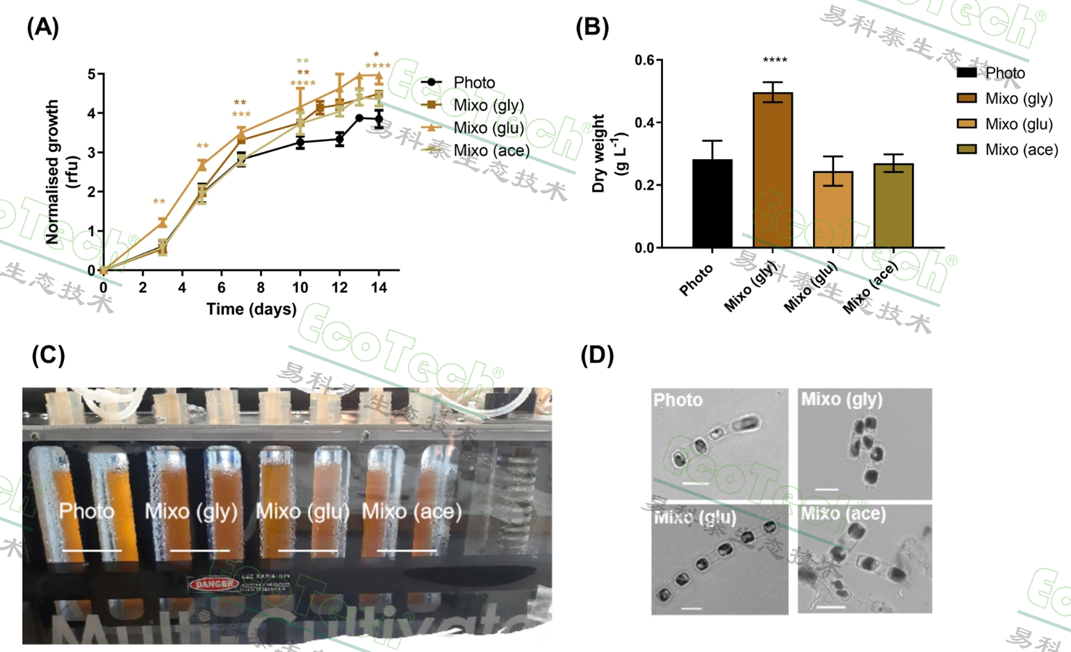 圖1 不同有機(jī)碳源添加條件下(Photo:光養(yǎng);Mixo (gly):添加10 mM甘油的混合營(yíng)養(yǎng);Mixo (glu):添加10 mM葡萄糖的混合營(yíng)養(yǎng);Mixo (ace):添加2.07 mM醋酸的混合營(yíng)養(yǎng))A:S. marinoi的葉綠素a熒光增長(zhǎng)曲線B:生物量產(chǎn)量(顯示甘油顯著提高了S. marinoi的生物量)C:使用多通道藻類培養(yǎng)與在線監(jiān)測(cè)系統(tǒng)培養(yǎng)最后一天的照片(顯示了混合營(yíng)養(yǎng)的藻液顏色比光養(yǎng)的對(duì)照組更深,意味著更高的生物量或色素含量)D:顯微成像(顯示甘油可能促進(jìn)了細(xì)胞聚集)
