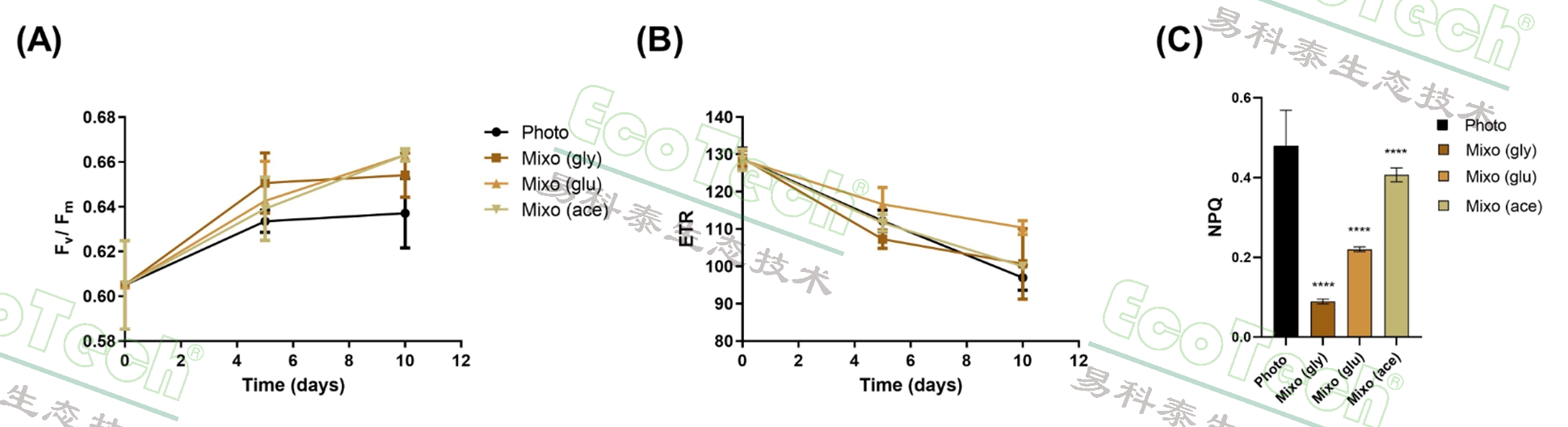 培養(yǎng)過(guò)程中,研究人員使用藻類葉綠素?zé)晒鈨x測(cè)量了諸如Fv/Fm(最大光量子產(chǎn)量)、NPQ(非光化學(xué)淬滅)和ETR(電子傳遞速率)等葉綠素?zé)晒鈪?shù);使用藻類光合測(cè)量?jī)x測(cè)定了光合速率和呼吸速率,從而綜合評(píng)估了不同碳源添加對(duì)Sm142的生理學(xué)影響。