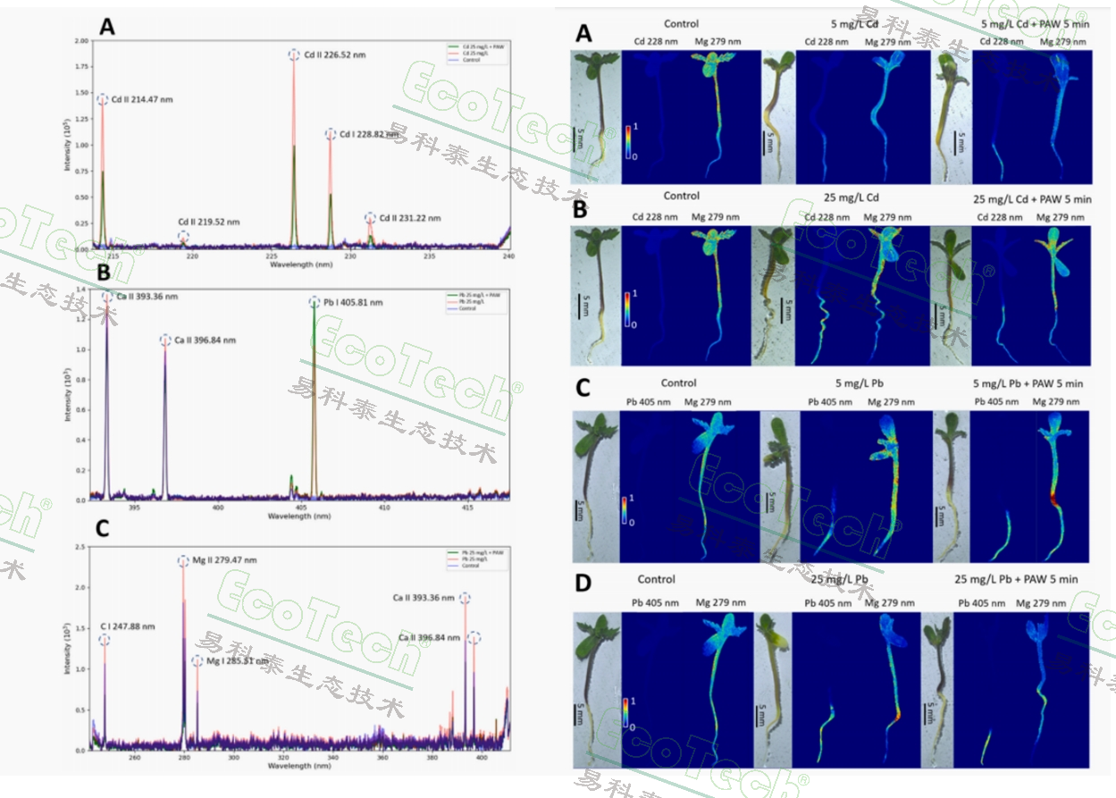 歐洲的科研團(tuán)隊(duì)在《Ecotoxicology and Environmental Safety》發(fā)表文章《Study of plasma activated water effect on heavy metal bioaccumulation by Cannabis sativa Using Laser-Induced Breakdown Spectroscopy》,使用FireFly LIBS元素分析成像技術(shù)研究了鎘和鉛重金屬污染對(duì)大麻生長(zhǎng)的影響。該研究通過等離子體活化水(PAW)處理,結(jié)合激光誘導(dǎo)擊穿光譜(LIBS)技術(shù),探究了大麻在鎘/鉛污染下的生長(zhǎng)及重金屬積累特性。結(jié)果表明,PAW顯著促進(jìn)鉛污染下大麻的生長(zhǎng)(根長(zhǎng)增加35%),但對(duì)鎘污染的緩解效果有限(抑制率降低15-20%)。ICP-OES分析顯示,鎘/鉛主要積累于根部(BAF分別為0.85/0.72),而LIBS技術(shù)通過100μm分辨率的元素映射首次揭示了重金屬與鎂元素的負(fù)相關(guān)分布(r=-0.65),并發(fā)現(xiàn)PAW可減少重金屬的局部富集。研究證明,LIBS技術(shù)不僅實(shí)現(xiàn)了痕量元素(Cd/Pb)的高靈敏度檢測(cè),還通過毫米級(jí)成像揭示了污染物與營(yíng)養(yǎng)元素的交互作用,較傳統(tǒng)方法效率提升60%。該研究為PAW輔助植物修復(fù)提供了直接的可視化證據(jù),同時(shí)驗(yàn)證了LIBS在生態(tài)毒理學(xué)研究中的技術(shù)優(yōu)勢(shì)。