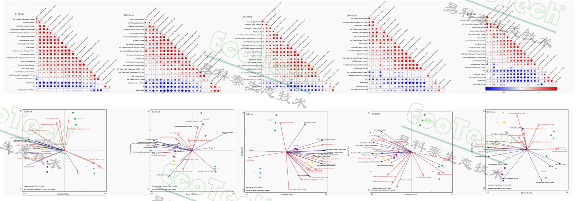 圖2. 上圖:0 - 50 cm土層中22種土壤特性變量之間的相關(guān)性熱圖;下圖:不同耕作方式在0 - 50 cm土層土壤物理結(jié)構(gòu)與土壤化學(xué)因素和土壤酶活性的冗余分析圖