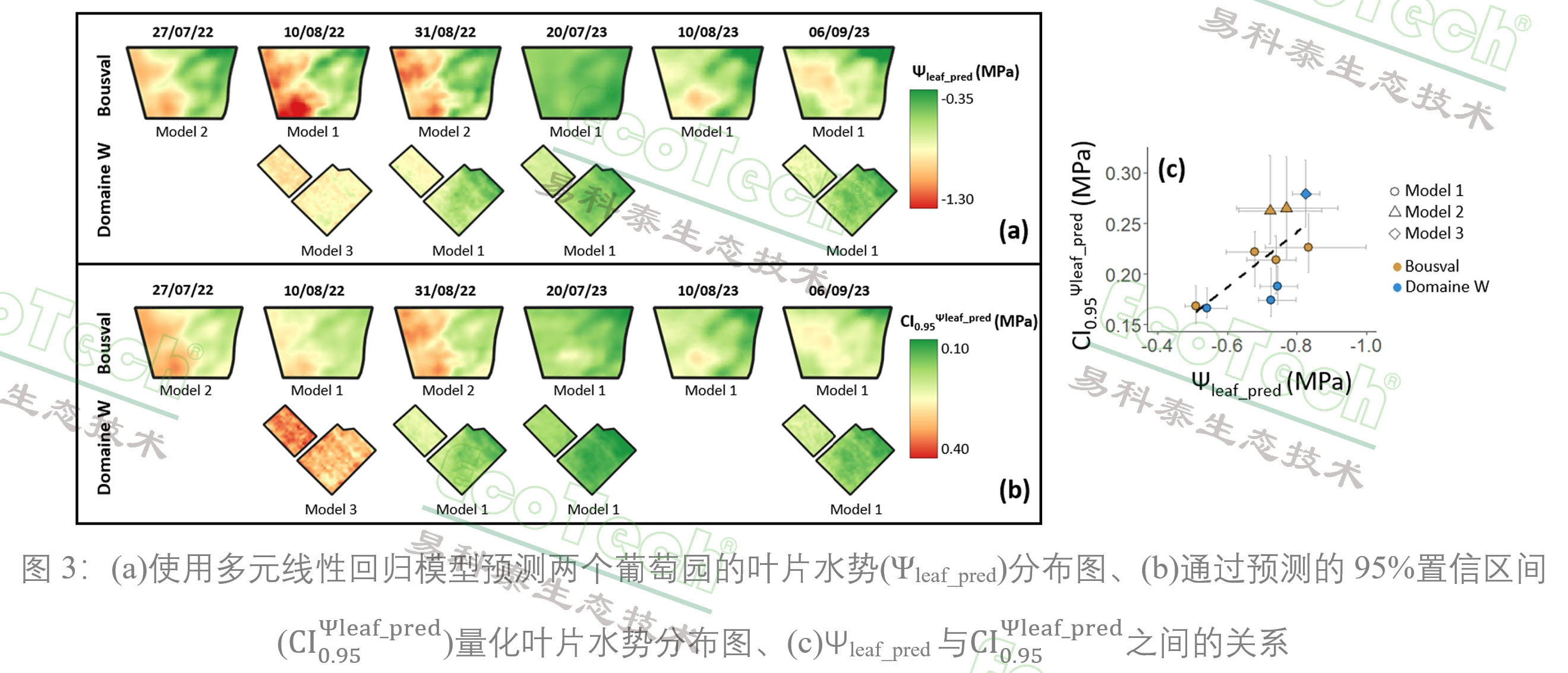 實(shí)驗(yàn)結(jié)果顯示,在非灌溉葡萄園中,雖然地形因素(如坡度和海拔)對(duì)葡萄葉片水勢(shì)(Ψleaf)的差異有一定影響,但其空間分布差異主要還是受到葡萄園內(nèi)土壤質(zhì)地的異質(zhì)性(如黏土和沙土的混合)的影響,在土壤水分脅迫或蒸發(fā)需求(氣候條件影響)時(shí)尤為明顯。通過(guò)結(jié)合多光譜、熱成像和激光雷達(dá)數(shù)據(jù),研究者能夠有效的捕捉葡萄園內(nèi)葡萄葉片水勢(shì)的空間分布,這種方法不僅提高了預(yù)測(cè)的準(zhǔn)確性,還減少了預(yù)測(cè)的不確定性。
