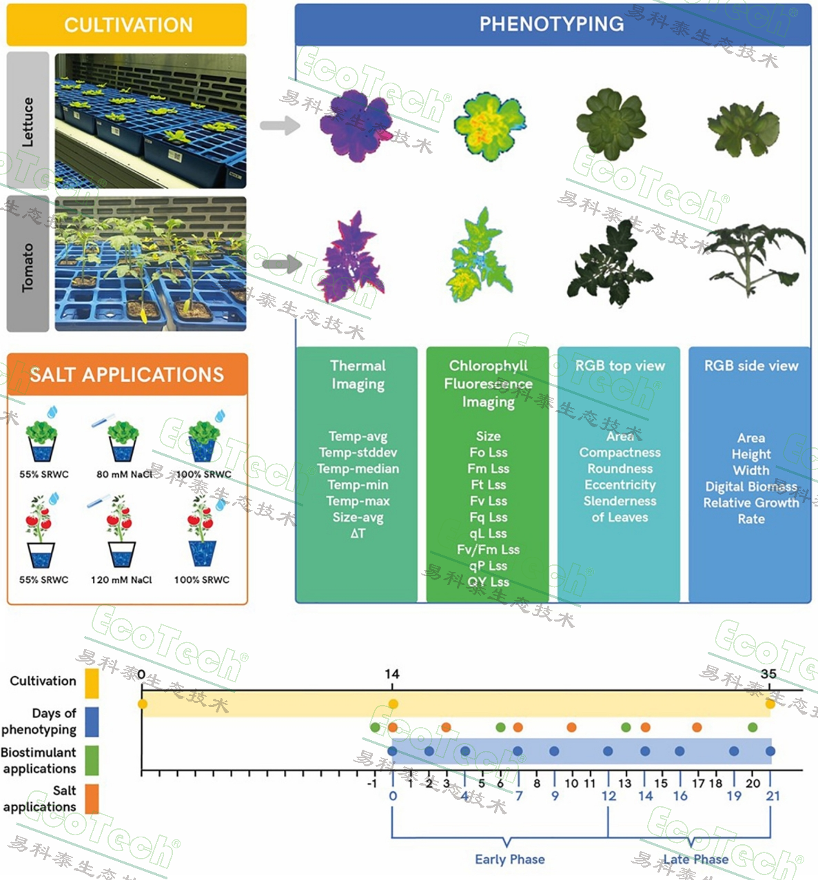 研究者使用植物表型組學(xué)和代謝組學(xué)的方法,研究了不同來源的蛋白質(zhì)水解物(PH)生物刺激劑對(duì)生菜和番茄在控制條件和鹽脅迫下的影響。結(jié)果表明,生菜和番茄植物在鹽脅迫下的生理響應(yīng)不同,鹽脅迫主要在實(shí)驗(yàn)的后期階段影響了生菜的生長和光合作用。另外,PHs改善了鹽脅迫條件下植物的生長和光合作用性能,尤其在生菜中作用更明顯。代謝組分析則揭示了PH處理在番茄和生菜植物中激活了不同的代謝途徑,包括次級(jí)代謝、輔因子/電子載體和植物激素的生物合成。
