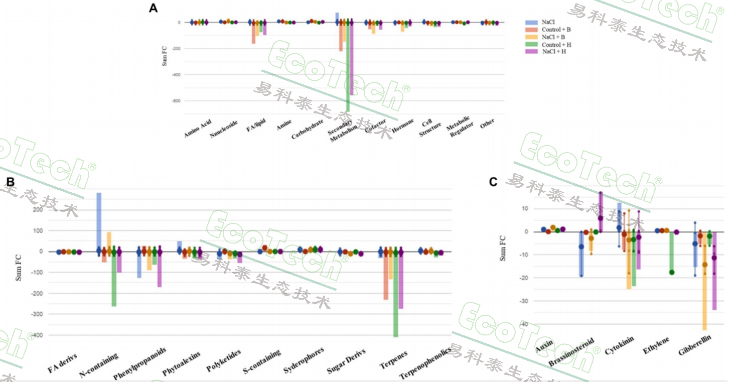 萵苣植物的代謝變化。與對(duì)照樣品相比,生菜植株的代謝過程(A)、次生代謝(B)和激素的生物合成受到了損害(C)