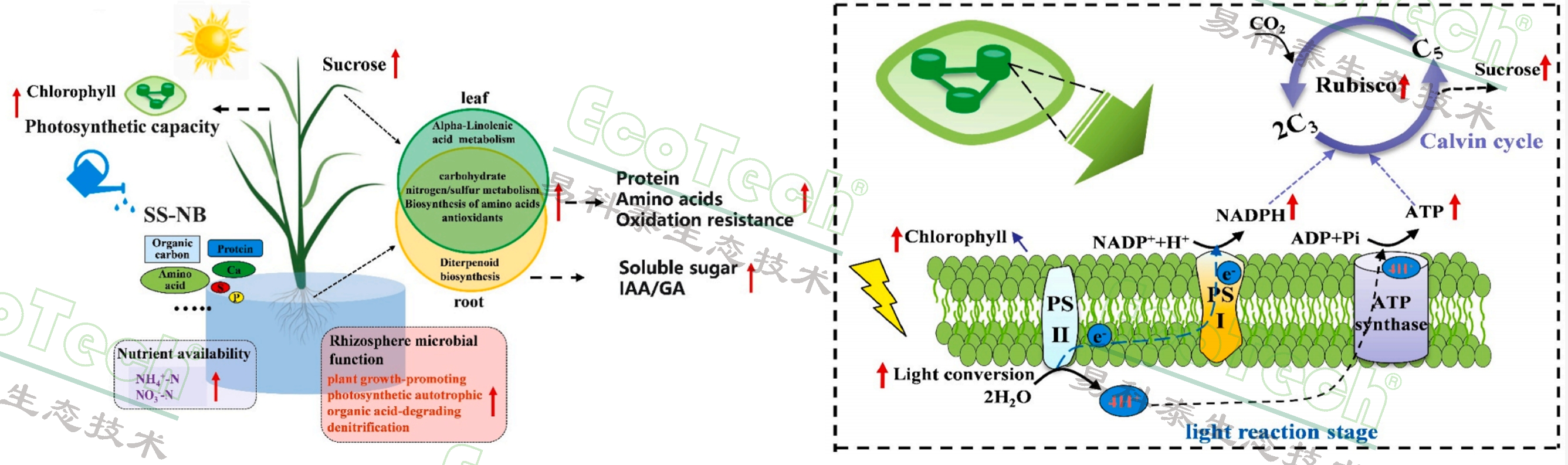 江南大學(xué)等單位發(fā)表的這篇文章中,研究了SS-NB對(duì)水稻葉片光合作用和根系代謝的影響,以及它們?nèi)绾卧鰪?qiáng)碳水化合物、氮和抗氧化劑的積累。研究發(fā)現(xiàn),與氮肥(NF)處理相比,SS-NB 通過提高光合效率、葉綠素含量、ATP合酶活性、Rubisco和NADPH產(chǎn)生來增強(qiáng)水稻葉片的光合作用。同時(shí),SS-NB 還增加了水稻葉片和根系中的抗氧化能力。代謝組學(xué)分析顯示,SS-NB 應(yīng)用增加了水稻根和葉組織中的代謝物表達(dá)水平,包括碳水化合物、氮和硫代謝、氨基酸代謝、抗氧化劑和植物激素。研究結(jié)果表明,SS-NB 在作物生長和逆境抗性改善方面具有很大的應(yīng)用潛力。未來的研究應(yīng)該關(guān)注SS-NB對(duì)作物品質(zhì)和安全性的影響,以及它如何可能抵消長期施用化學(xué)肥料對(duì)作物生產(chǎn)和農(nóng)業(yè)系統(tǒng)中根系-微生物相互作用的不利影響。