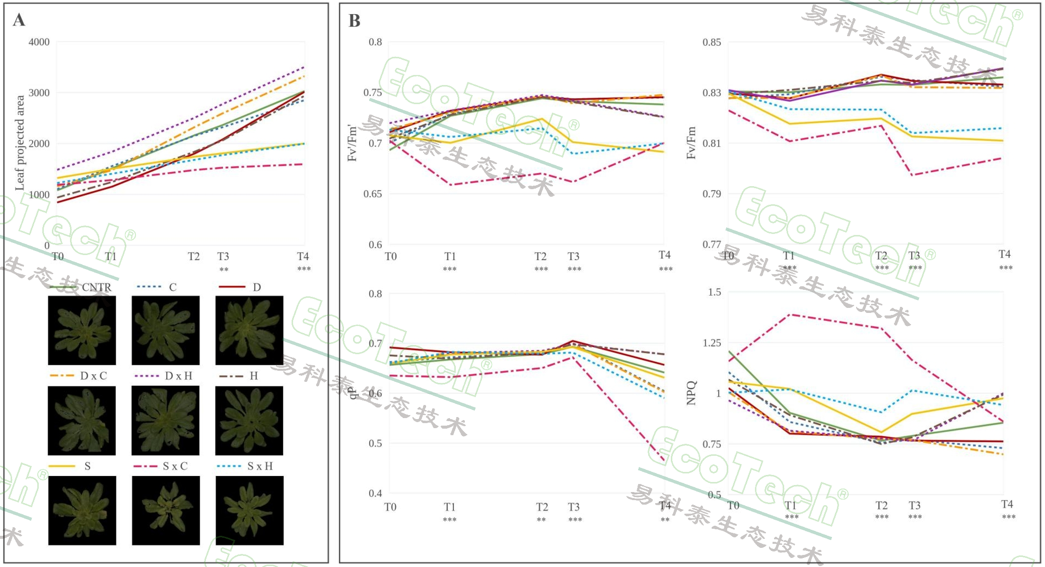 研究中,在播種38天后將擬南芥幼苗分為9組作并不同處理,每組4個(gè)生物學(xué)重復(fù)。在播種后的38,40,43,44,47天即T0,T1,T2,T3,T4,使用PlantScreen高通量表型分析系統(tǒng)對(duì)擬南芥進(jìn)行RGB成像、葉綠素?zé)晒獬上?,以檢測(cè)不同處理對(duì)擬南芥形態(tài)學(xué)特征和光合特性的影響。另外,還通過脂質(zhì)過氧化、電解質(zhì)泄露、非靶向代謝物分析、靶向代謝物分析等方法進(jìn)行代謝組分析。