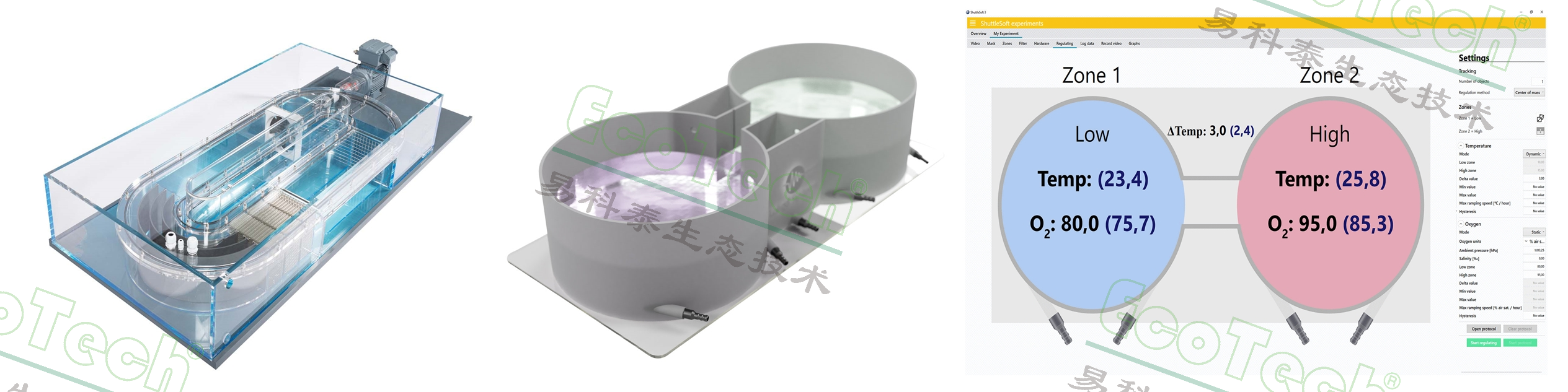 圖2左:魚類游泳能力研究系統(tǒng);圖2中/右:穿梭池動物喜好度觀測系統(tǒng)及數(shù)據(jù)分析界面
