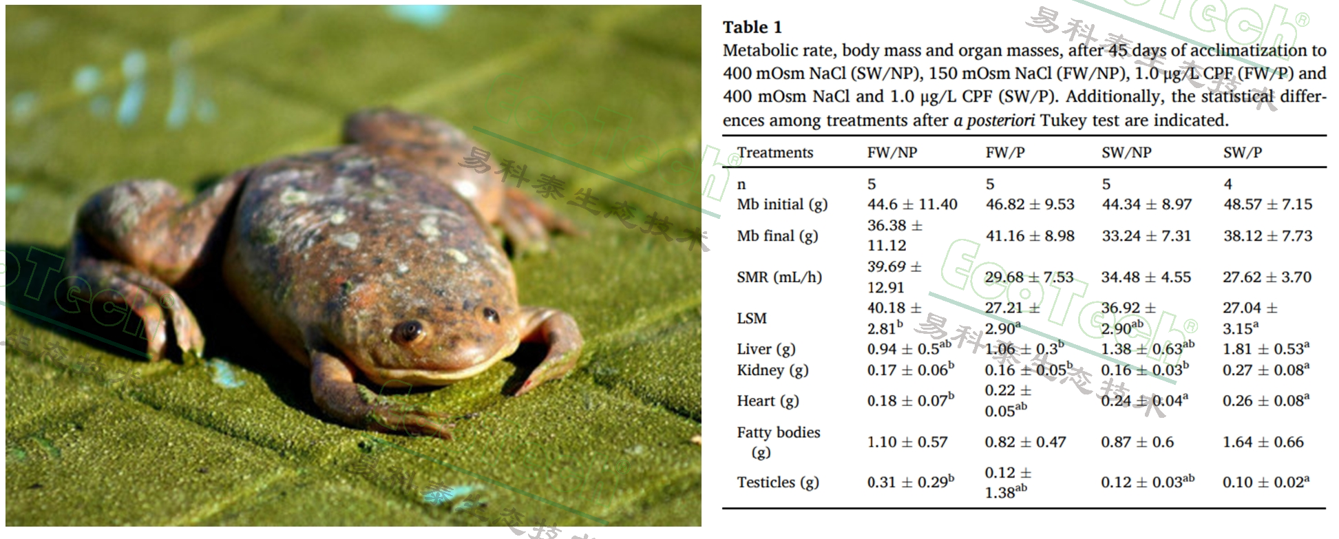 Alvarez-Vergarat團隊利用便攜式能量代謝系統(tǒng)研究了鹽度和有機磷農(nóng)藥氯氰菊酯(CPF)對非洲爪蟾(Xenopus laevis)的生理和代謝影響。實驗設(shè)置了兩種鹽度環(huán)境(150 mOsm和400 mOsm NaCl)以及兩種農(nóng)藥濃度(0和1.0 μg/L CPF),并讓成年雄性非洲爪蟾暴露于這些環(huán)境45天。