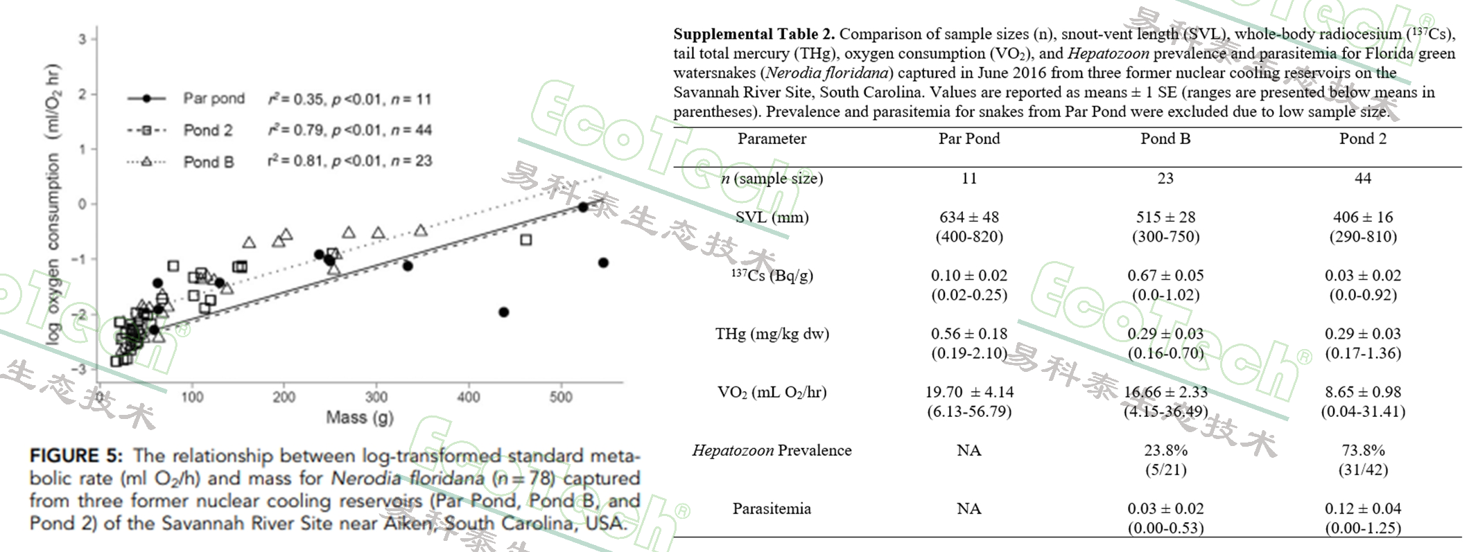 Brown等人(University of Georgia)利用便攜式能量代謝系統(tǒng)研究了汞(Hg)和放射性銫(137Cs)在佛羅里達綠水蛇(Nerodia floridana)中的生物累積及亞致死效應。研究團隊從美國能源部薩凡納河基地(South Carolina, USA)的三個前核冷卻水庫中捕獲了 78 條佛羅里達綠水蛇,并通過能量代謝系統(tǒng)測量了它們的標準代謝率(SMR)。