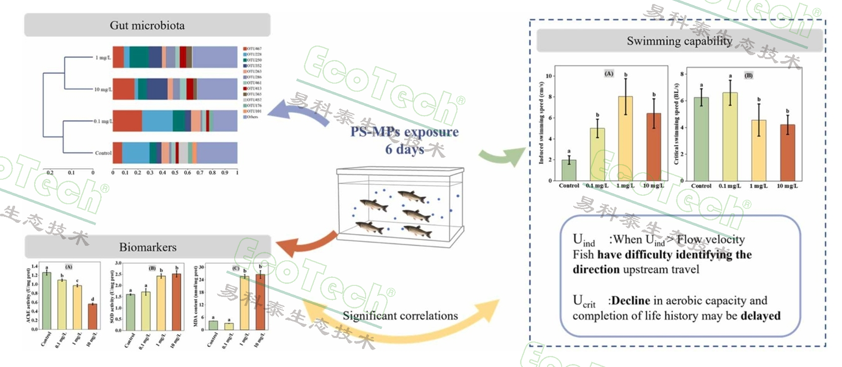 結(jié)果顯示,PS-MPs暴露顯著抑制了草魚大腦中的乙酰膽堿酯酶(AChE)活性,并在1和10 mg/L暴露濃度下顯著增加了超氧化物歧化酶(SOD)活性和丙二醛(MDA)水平,同時改變了草魚腸道微生物群落并降低了香農(nóng)多樣性指數(shù)。此外,PS-MPs顯著提高了草魚的誘導游泳速度,并降低了臨界游泳速度,這可能延遲草魚完成生命周期。研究還發(fā)現(xiàn)生物標志物與游泳能力指標之間存在顯著相關(guān)性。該研究結(jié)果表明,微塑料對魚類的生理特性產(chǎn)生了負面影響,降低了遷徙魚類的游泳能力,強調(diào)了微塑料污染可能對水生生態(tài)系統(tǒng)功能和生物多樣性的長遠影響,為理解持久性污染物微塑料對水生生態(tài)系統(tǒng)的影響提供了新的見解。
