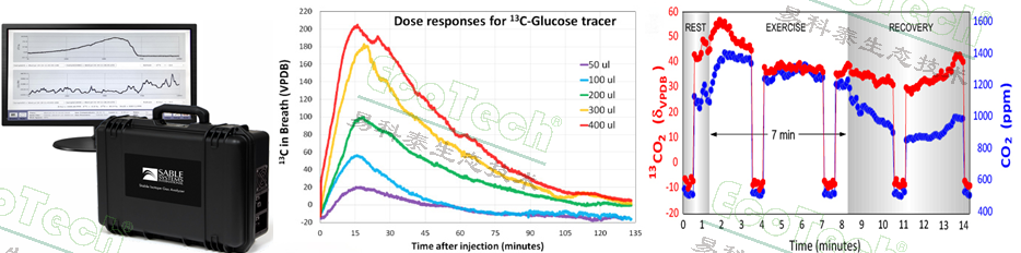 圖1 左:動(dòng)物穩(wěn)定同位素分析儀;中:不同劑量13C-葡萄糖示蹤劑的劑量反應(yīng)曲線;右:運(yùn)動(dòng)狀態(tài)下13C-棕櫚酸標(biāo)記體脂的氧化動(dòng)態(tài)變化