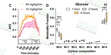 Vanderbilt團(tuán)隊(duì)在《Nature Communications》發(fā)表了一項(xiàng)研究成果,給清醒小鼠持續(xù)靜脈輸注高vs低劑量[U-¹³C?]-葡萄糖,他們發(fā)現(xiàn):高劑量組(40mg)60min內(nèi)13CO2呼出達(dá)到平臺(tái)期,同時(shí)抽血測(cè)葡萄糖同位素標(biāo)記,發(fā)現(xiàn)80%的葡萄糖分子6個(gè)碳全部被13C取代(M+6),把肝臟取出來(lái)測(cè)糖原,發(fā)現(xiàn)其葡萄糖單元里有30–50%是13C標(biāo)記的,證明從血液里“現(xiàn)成”的13C-葡萄糖直接被肝臟抓去合成糖原,合成速度極快;結(jié)合MALDI-MS成像、MIMS-EM等技術(shù),該研究首次把“器官-細(xì)胞-細(xì)胞器”三級(jí)代謝圖譜串成一條時(shí)間軸。