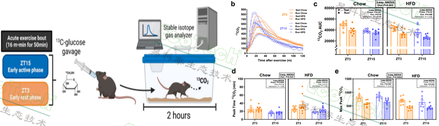 為了探討運(yùn)動(dòng)時(shí)間(晝夜節(jié)律)對(duì)運(yùn)動(dòng)后底物代謝的影響,以及肥胖如何改變這種“時(shí)間-代謝”可塑性,Karolinska與哥本哈根團(tuán)隊(duì)讓lean與HFD小鼠分別在靜息期(ZT3)或活動(dòng)期(ZT15)跑臺(tái)60min,隨后灌胃[U-¹³C6]-葡萄糖并連續(xù)測(cè)¹³CO2呼出。