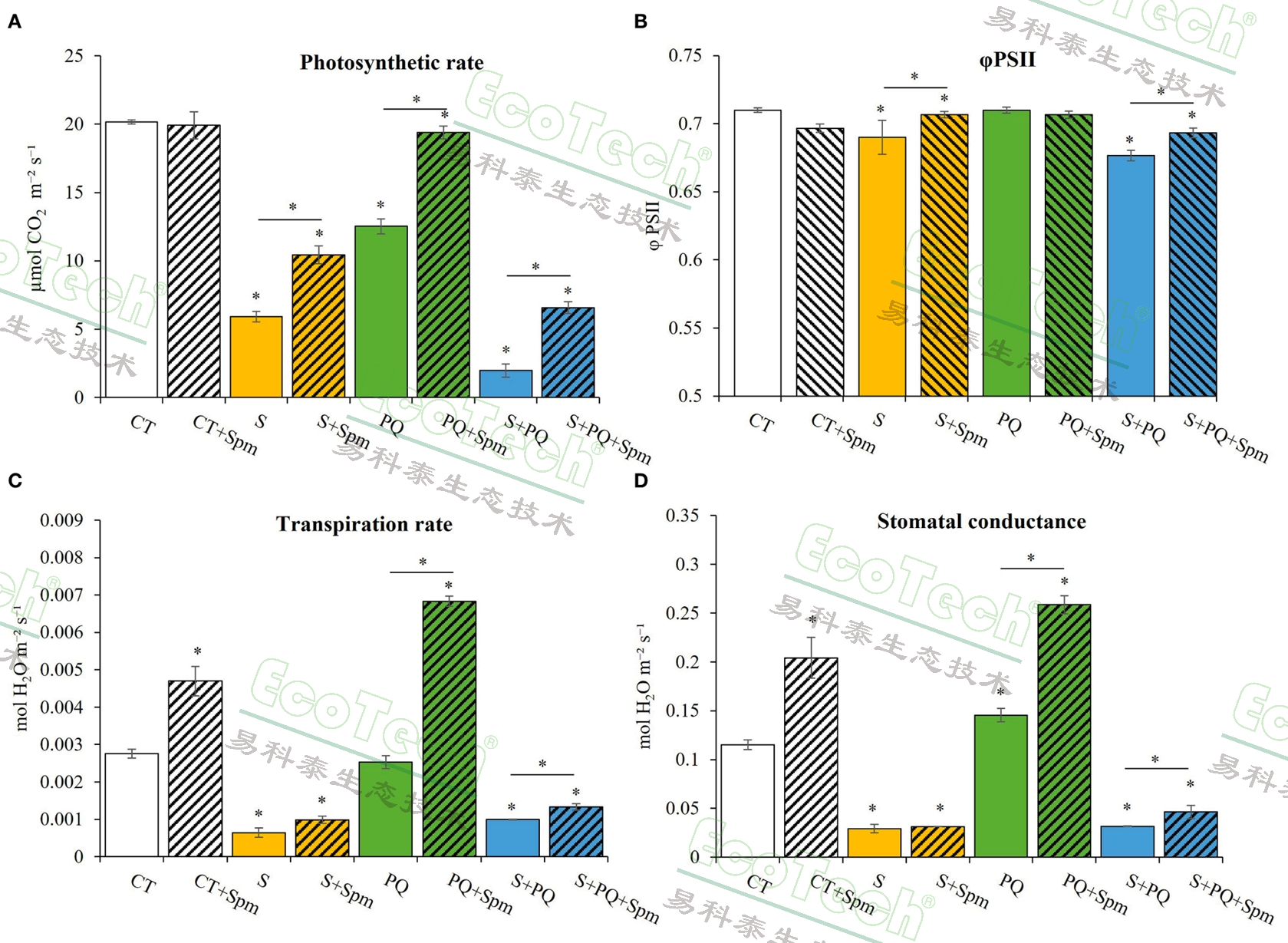 精胺(Spm)是一種多胺類化合物,已被廣泛證明能夠調(diào)節(jié)植物的生理功能,包括抗氧化防御、光合作用效率、細(xì)胞修復(fù)以及基因表達(dá)等。本文研究了外源精胺(Spm)對番茄植株在鹽脅迫(S)和除草劑百草枯(PQ)復(fù)合脅迫下的緩解作用。該研究發(fā)現(xiàn)外源精胺處理能夠顯著提高番茄植株的存活率、生長狀況、光系統(tǒng)II功能和光合速率,并減少氧化損傷標(biāo)志物(如H?O?和丙二醛)的積累。進一步研究發(fā)現(xiàn),精胺通過降低氧化應(yīng)激,改善了番茄在復(fù)合脅迫下的耐受性。該研究為應(yīng)對氣候變化和土壤污染等多重脅迫提供了潛在的解決方案。