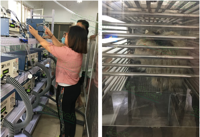 從左至右:易科泰工程師安裝調(diào)試6通道家畜能量代謝測(cè)量裝置與定制綿羊呼吸室